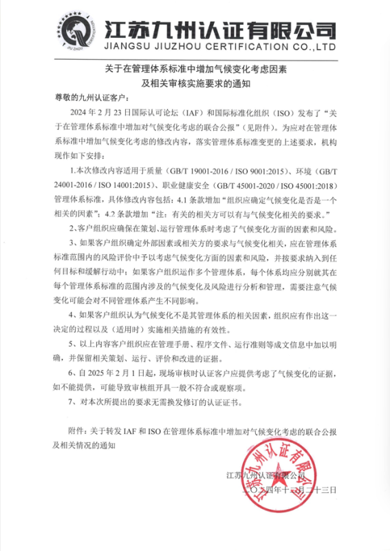 江蘇九州認(rèn)證有限公司關(guān)于在管理體系標(biāo)準(zhǔn)中增加氣候變化考慮因素及相關(guān)認(rèn)證實(shí)施安排的通知